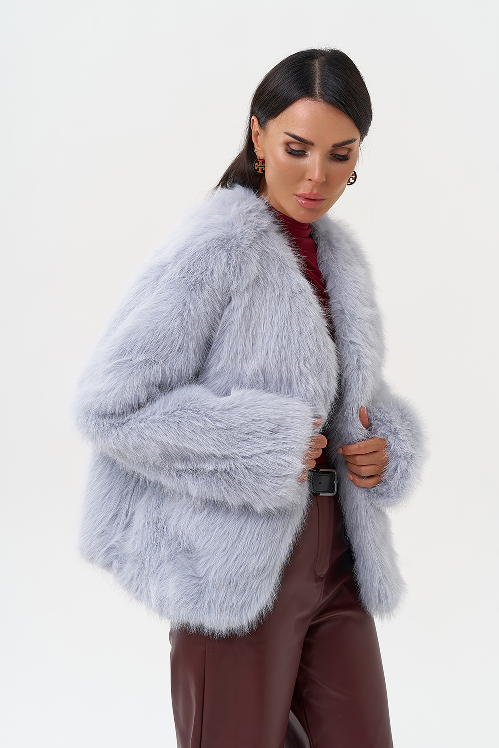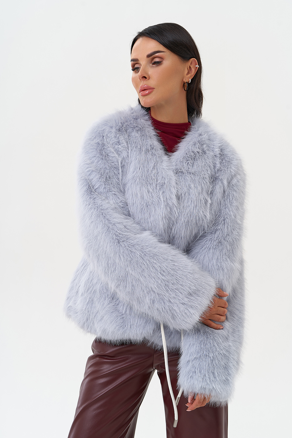 Фасон - прямой Длина изделия - 60 см Цвет - голубой Материал - экомех Состав полотна - полиэстер 100% Подкладка - полиэстер 100% Вид застежки -крючки, пояс Вид ворота - V-образный Фасон рукава - спущенное плечо, длинный |